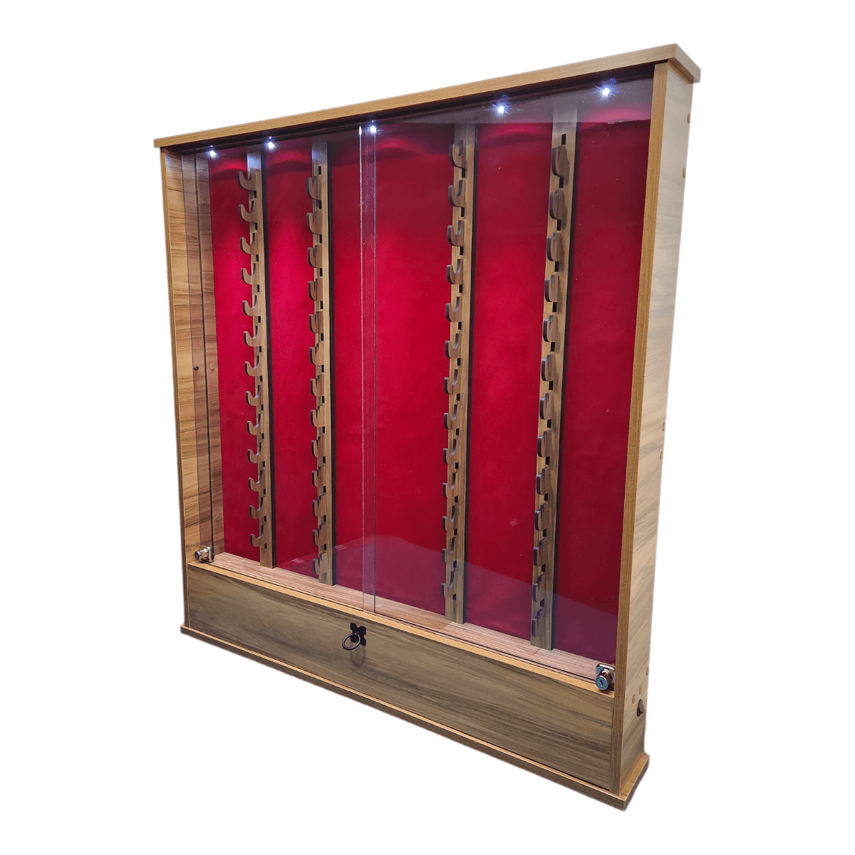 Este expositor é perfeito para quem aprecia a arte de colecionar facas e deseja um espaço dedicado para exibi-las.